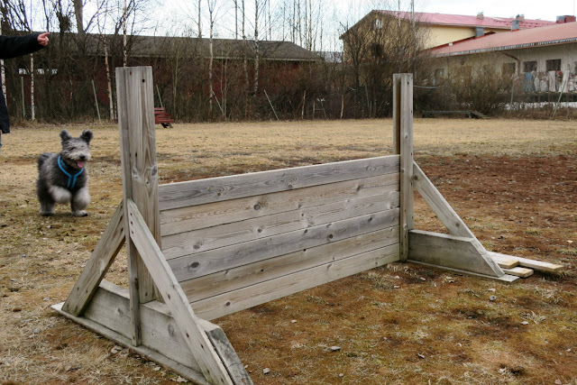 Armaksen kanssa otimme siis nopeita luoksetuloja sekä aloitimme viimein pk-hypyn treenaamisen. Onneksi muistin treenikassissa olevan makupala-automaatin, joka helpotti kovasti palkkausta. Armaksen vire nousi heti korkealla ja hypyt olivat ilmavia ja tehokkaan näköisiä. Aloitin heti alkuun hyppyyttämällä koiran edestakaisin. Ilta oli valitettavasti pitkällä hämyineen ja koira niin nopea, ettei kamera ehtinyt tarkentaa koiraan. Puuesteellä hyppyytin korkeimmillaan 70 cm korkeita hyppyjä muutaman toiston. Siitä korkeammat täytyy sitten treenata kangashypyllä, joka on turvallisempi, mikäli koira ottaa osumaa esteeseen.